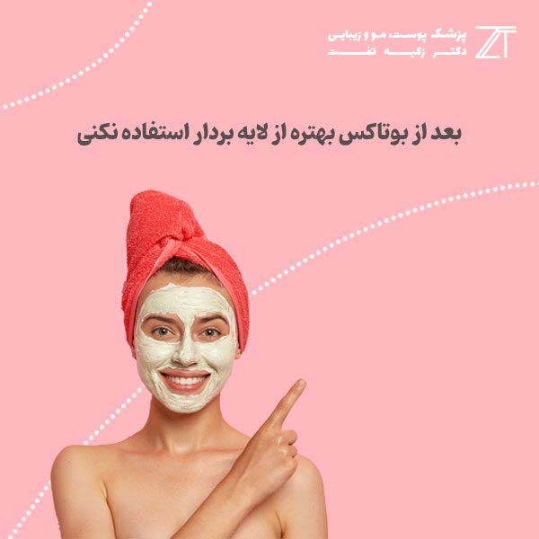 بعد از بوتاکس نیز بهتر است به پوست خود کمی زمان کمی دهید تا بهبود یابد و تحت هیچ گونه دستکاری اضافی که امکان دارد باعث اختلال در روند تزریق بوتاکس شود، قرار نگیرید. لذا برای انجام هر نوع لایهبرداری شیمیایی بهتر است یک هفته صبر داشته باشید.