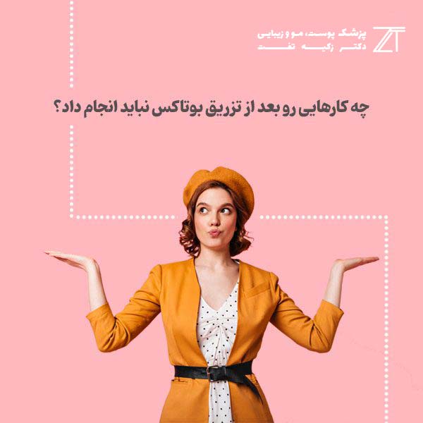 پس از انجام بوتاکس باید از انجام بعضی کارها خودداری کنید تا نتیجه حاصل از انجام تزریق بوتاکس شما تحت تاثیر قرار نگرفته و با عوارض جانبی و خطرات احتمالی تزریق بوتاکس رو به رو نشوید. در ادامه برخی از کارهایی که باید پس از انجام بوتاکس از انجام آنها دوری کنید برای شما بیان شده است: