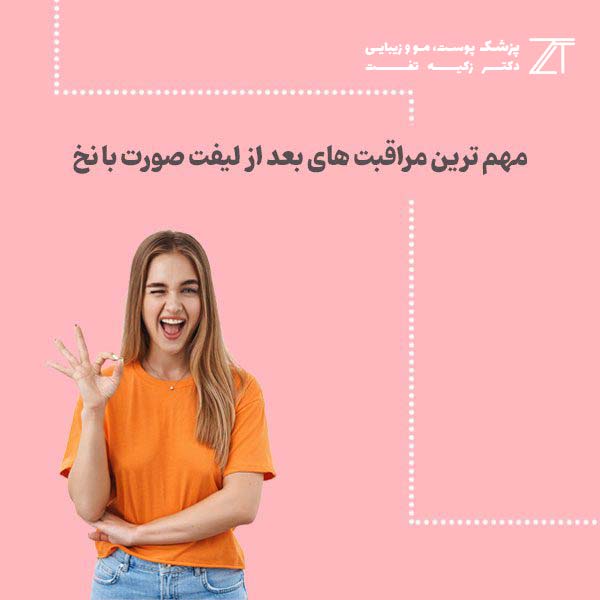 - دستوراتی که پزشک پس از انجام عمل برای افراد ارائه می کند جز نکاتی است که باید به آن اشاره کنیم. مراقبت های قبل و بعد از عمل توسط پزشک متخصص در زمینه ی لیفت نخ ارائه خواهد شد و فرد بیمار باید این دستورات برای گرفتن نتایج مثبت به خوبی انجام دهد زیرا با انجام این دستورات فرد می تواند از نظر ماندگاری نتایج خوبی را برای خود رقم خواهد زد.