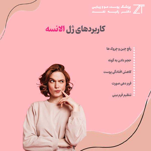 - ژل الانسه برای رفع چین و چروک های سطحی، متوسط، عمیق؛ حجم دادن به گونه، کاهش افتادگی پوست، فرم دهی صورت، برطرف کردن جای زخم و اسکار، تنظیم فرم بینی، گوش و برطرف کردن عدم تقارن در اجزای صورت مورد استفاده قرار می گیرد. ژل الانسه غلظت بالایی دارد و بنابراین در هنگام تزریق جا به جا نمی شود و در ناحیه تزریق باقی می ماند.