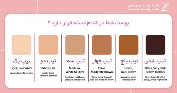 کامل ترین دسته بندی پوست، دسته بندی دكتر نوئل فيتز پاتريك است كه براساس رنگ پوست، رنگ مو، رنگ چشم و واكنش پوست به نور خورشيد، انواع مختلف پوست رابه شش گروه تقسيم كرده است.