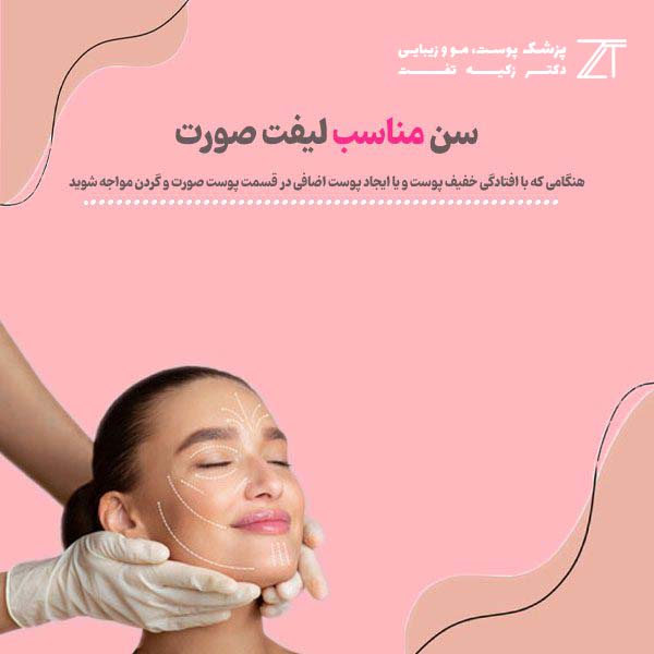 انجام لیفت پوست صورت در هر سنی با کشیدن عضلات و فاشیاهای پوست صورت میپذیرد. لیفت صورت موجب از بین رفتن چین و چروکهای سطح پوست میشود. بعضی مواقع برای بدست آرودن نتیجه بهتر لیفت پوست صورت را همزمان با سایر عملهای زیبایی انجام میدهند مثل لیفت پیشانی و ابرو، لیفت گردن و بلفاروپلاستی. بهترین سن لیفت صورت هنگامی عنوان میشود که افراد پا به افزایش سن گذاشته باشند.