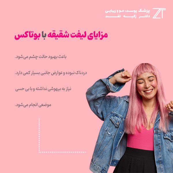 - در حالی که لیفت شقیقه با جراحی امکان دارد پیچیده باشد، لیفت با بوتاکس اینطور نیست. اگر نمیدانید لیفت شقیقه با بوتاکس چگونه صورت میگیرد یا فکر میکنید ممکن است ساعتها درد داشته باشد، اشتباه میکنید.